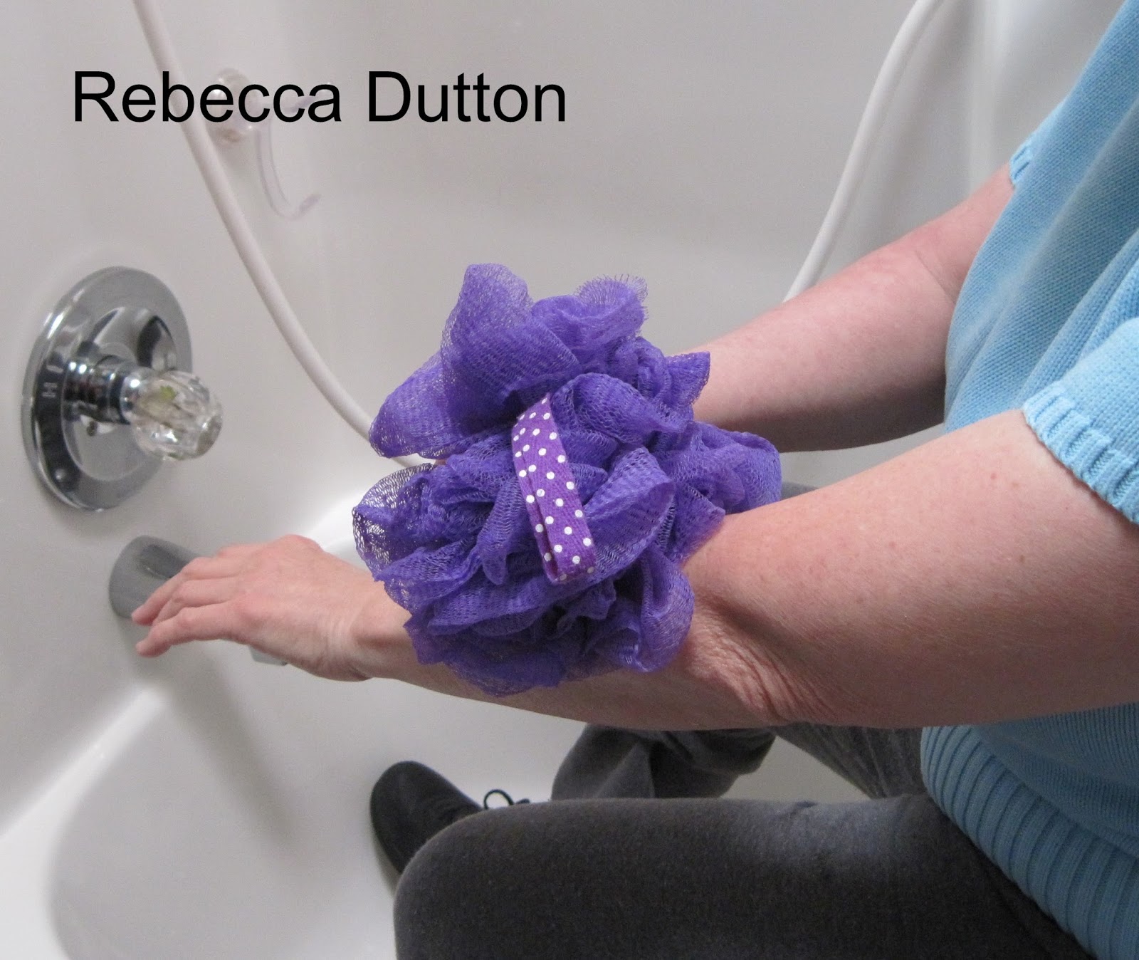 Washing. I do not struggle to soap up a washcloth one-handed or chase a bar of soap after I drop it. I pour shower gel on a nylon poof and knead it a few times to get it soapy. To wash my sound arm, I use a gross grasp in my affected hand to hold the nylon poof. I do not struggle to wring out a washcloth one-handed. I hang the nylon poof on a suction-cup hook, hose it down, and let it air dry. I use shampoo suds to wash my face.