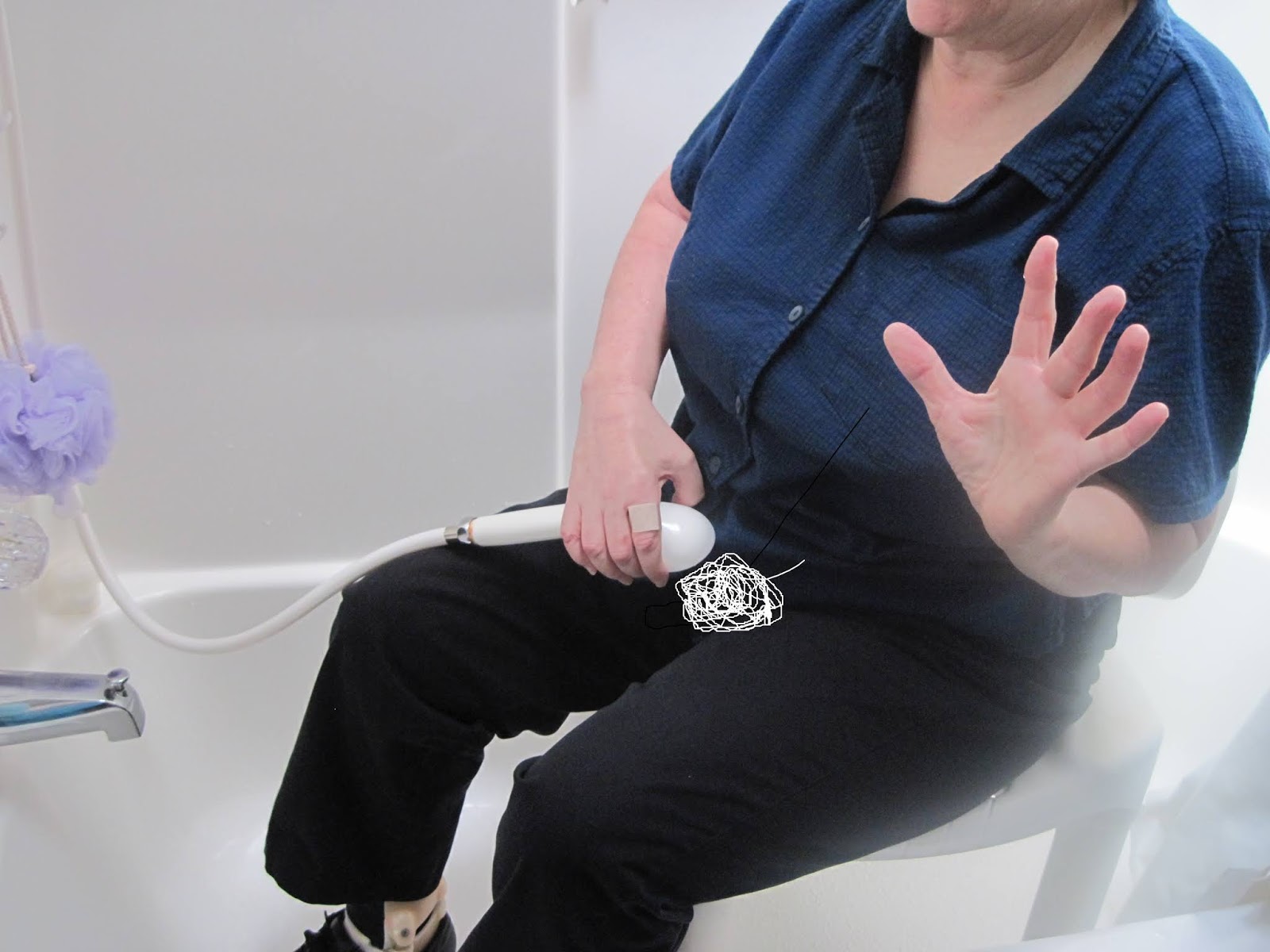 I press down on the nylon poof that is resting on my thighs to squeeze out suds so my sound hand can soap up my crotch. Before I could hold the shower hose with my hemiplegic hand,